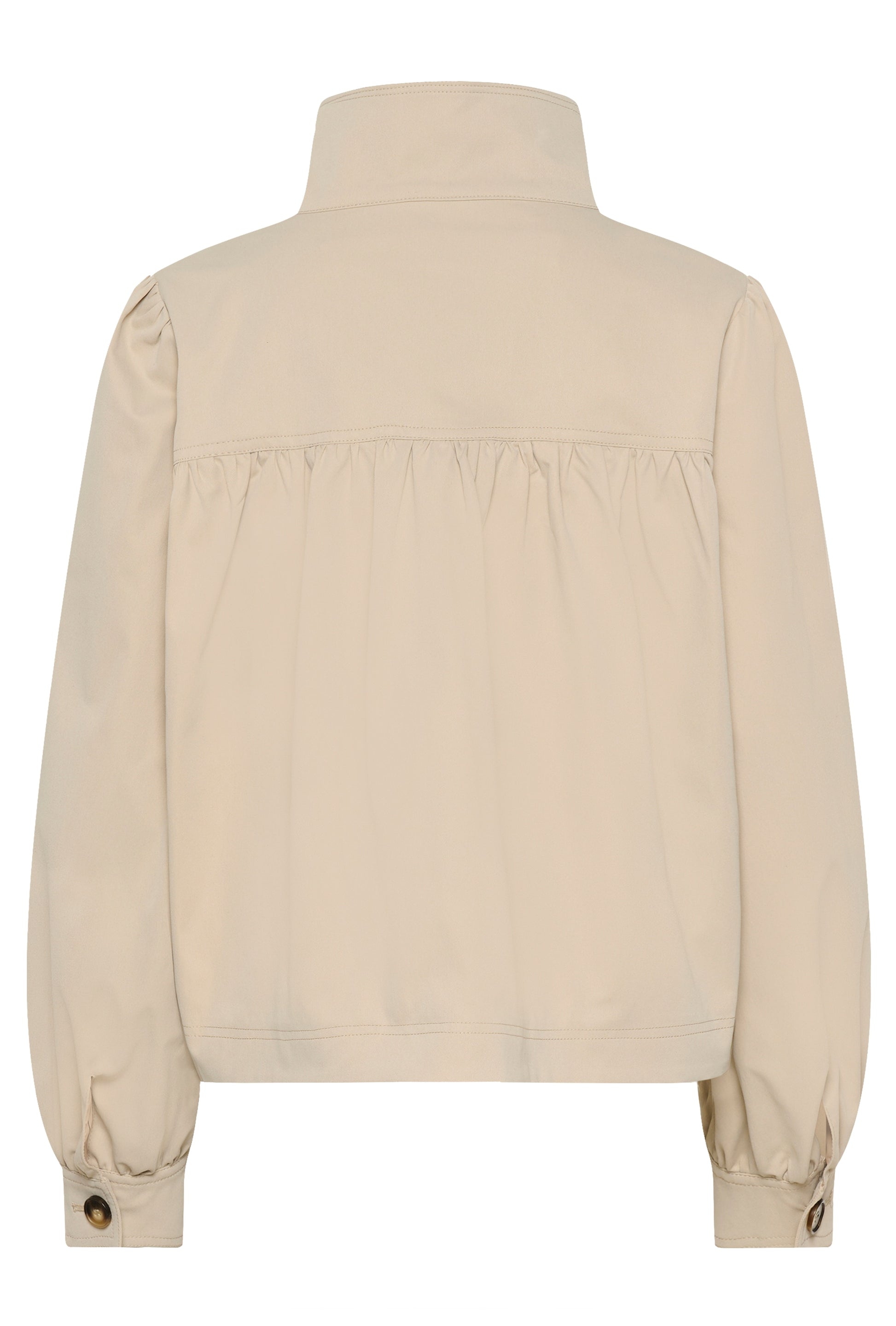 This short jacket features a straight silhouette with a stand-up collar secured by a visible button. The front has a concealed placket, and the long sleeves are gently gathered at the cuffs. The finish is smooth and lightly structured.